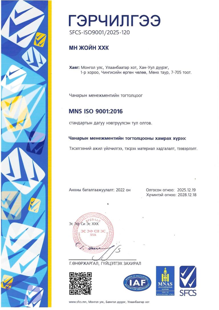 Бид 2022 онд анх ISO 9001 стандартын шаардлагыг хангаж, чанарын менежментийн тогтолцоог нэвтрүүлсэн бөгөөд энэ удаа давтан баталгаажуулалтаа амжилттай хийж, 2028 оны 12-р сарын 18 хүртэл хүчинтэй гэрчилгээ гардан аваад байна